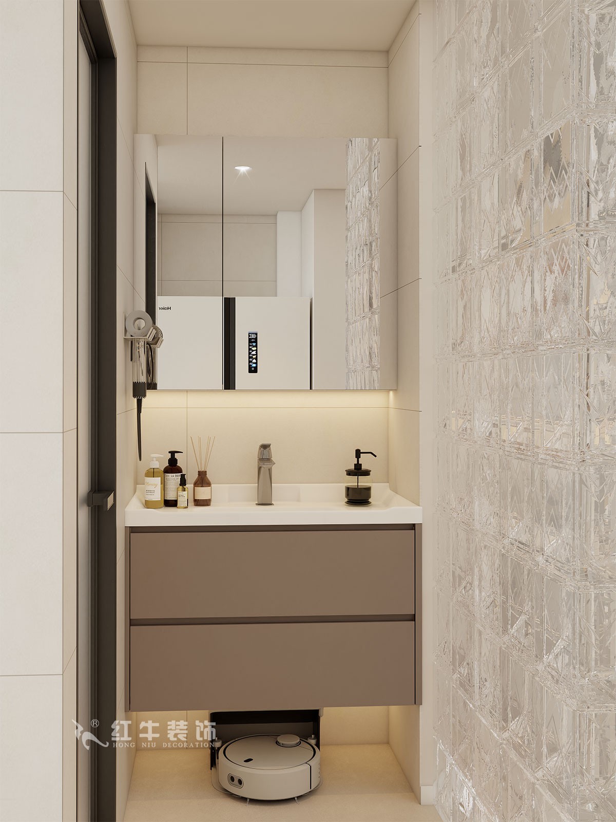 衛(wèi)生間說明:干區(qū)選擇整體色彩搭配干凈、大方,選擇大尺寸瓷磚上墻,高級感滿滿。